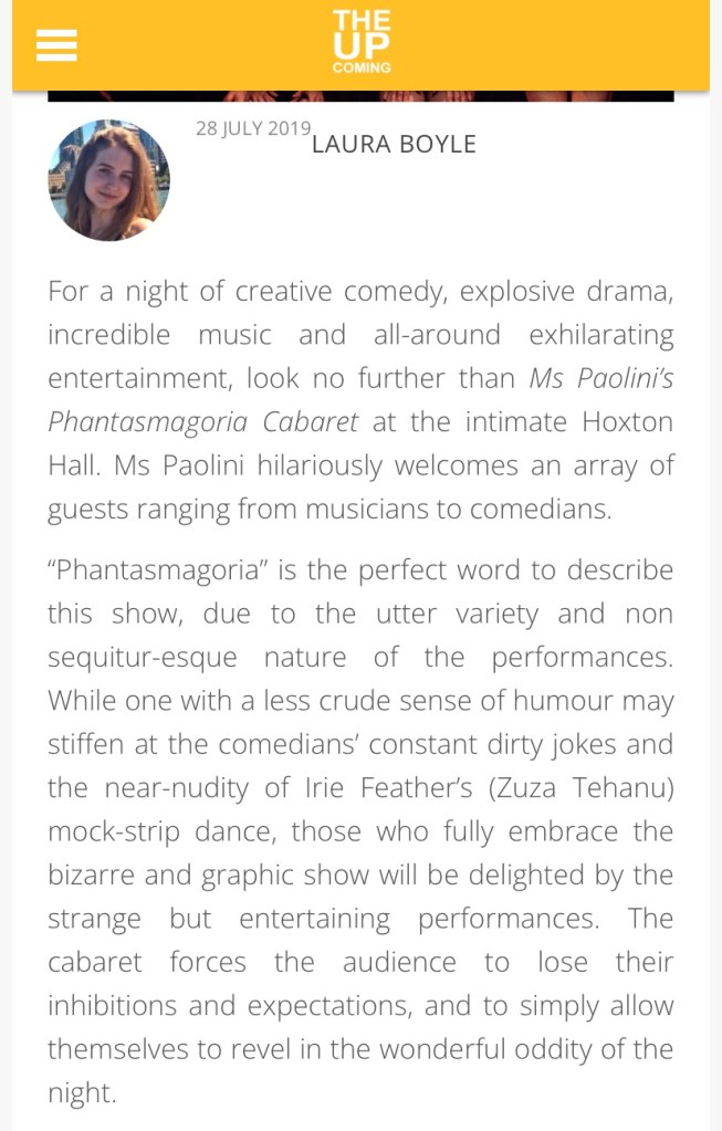 THE UPCOMING REVIEW OF “YOUR SOUL MATTERS” ON MS PAOLINI PHANTASMAGORIA CABARET IN HOXTON HALL